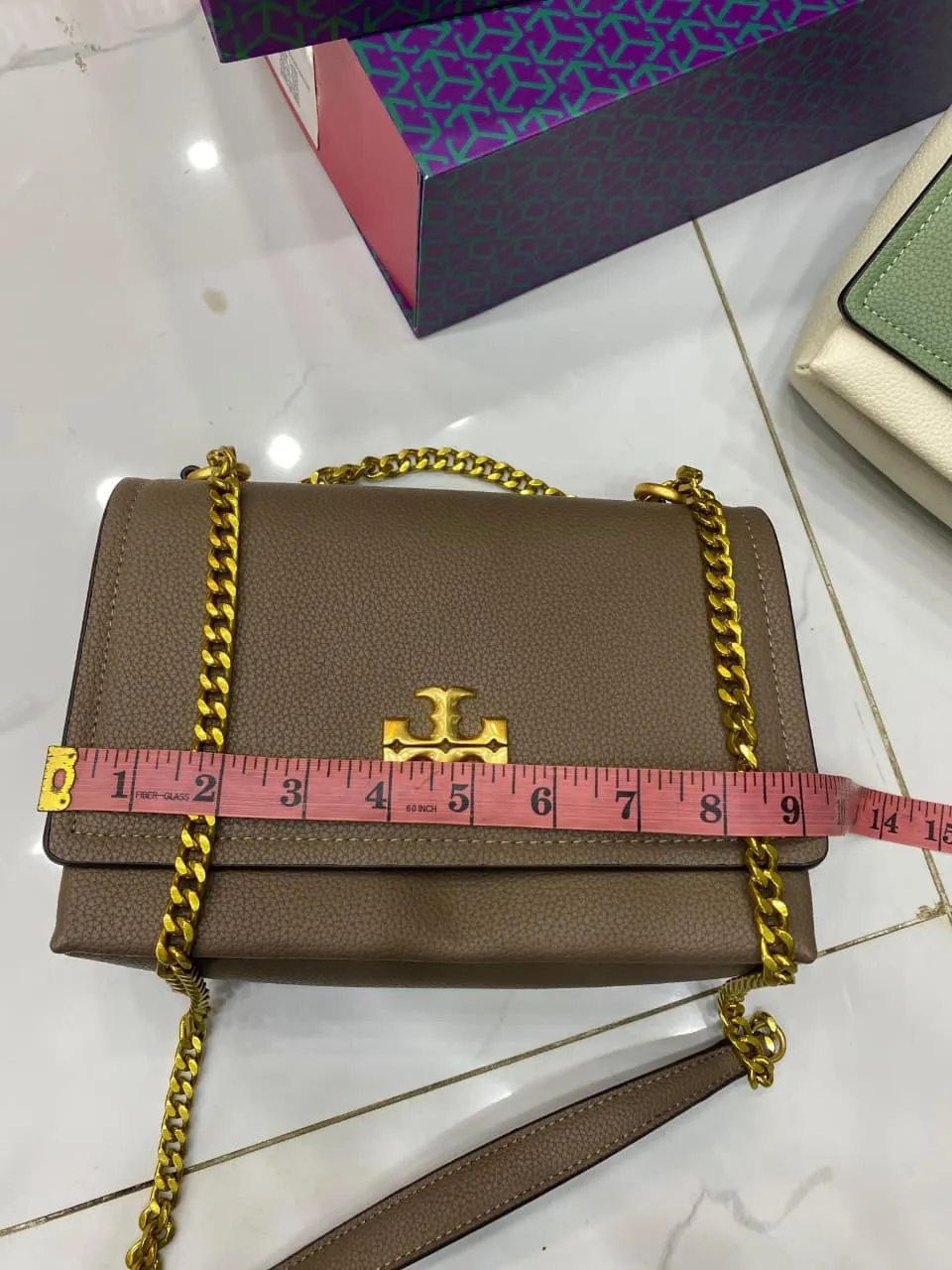 The official Tory Burch Caviar Leather Chain Bag features a structured silhouette with a detachable chain strap. Measuring 9.5 x 7 inches, it comes with a magnetic gift box, authenticity card, and dust bag for a luxury unboxing experience.